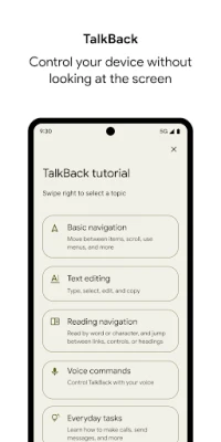• TalkBack screen reader: Get spoken feedback, control your device with gestures, and type with the on-screen braille keyboard.