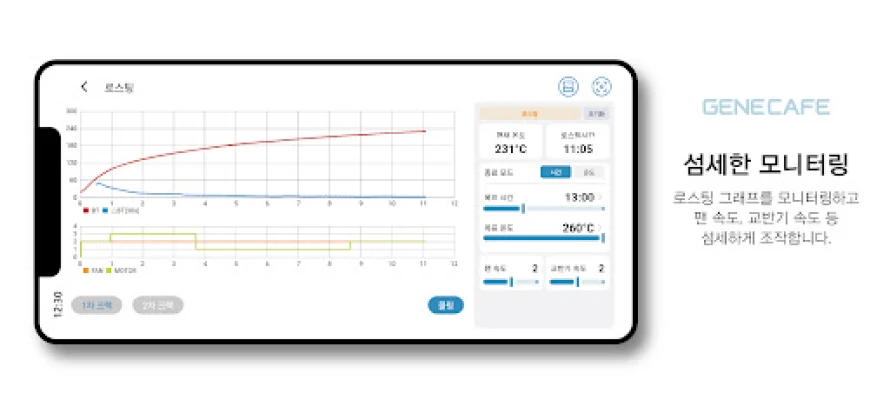 Gene Cafe는 커피 로스팅을 더욱 스마트하고 편리하게 만들기 위해 개발된 앱입니다. 블루투스를 통해 로스팅 머신과 연결하여 실시간으로 로스팅 상태를 모니터링하고, 원하는 설정값을 원격으로 조정할 수 있습니다. 또한 완료된 로스팅 데이터를 저장할 수 있으며, 다른 사용자와 공유할 수 있습니다.
