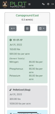 A first of its kind food plot management system by Whitetail Institute. Direct integration with Whitetail Institute's soil testing allows you to quickly send and receive soil sample test results! Flexible, detailed journal allowing food plotters to keep historical and current information about all their food plots. Mapping makes the information you track available by a click on the plot. Fertilizer, lime and spray calculators make calculating quantity of product to use easy. Off season planning allows calculation of seed needed based upon Whitetail Institute's recommended rates.